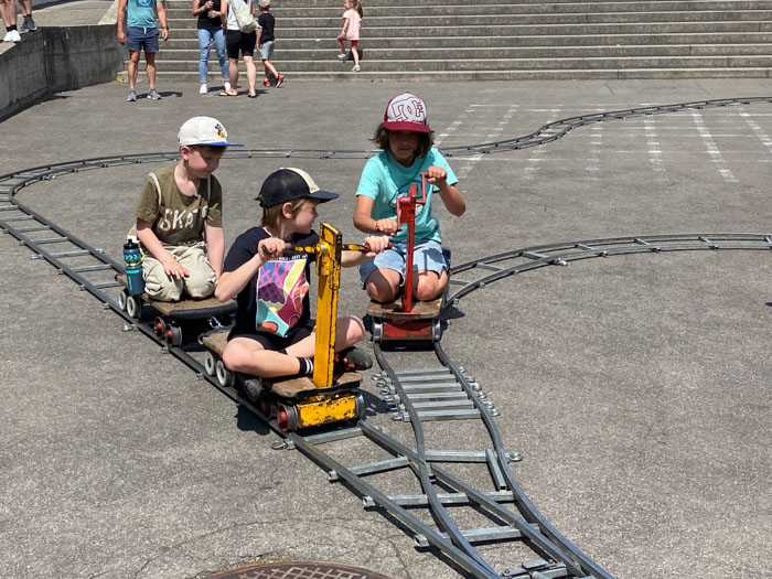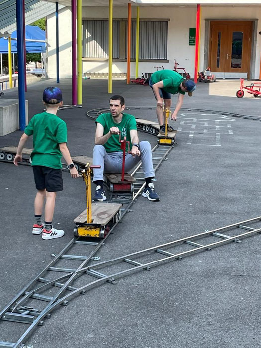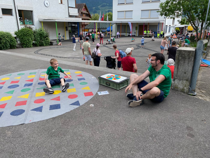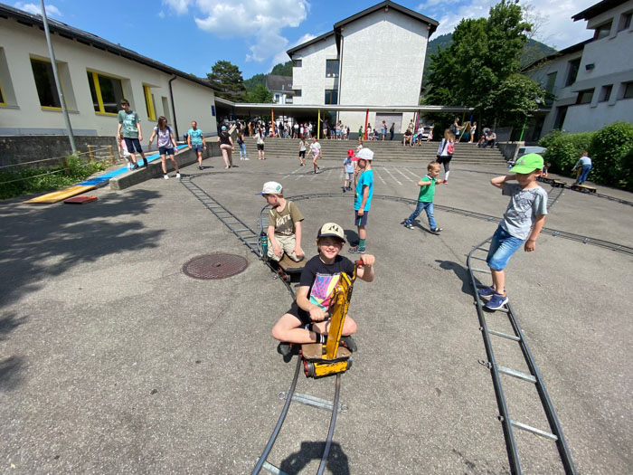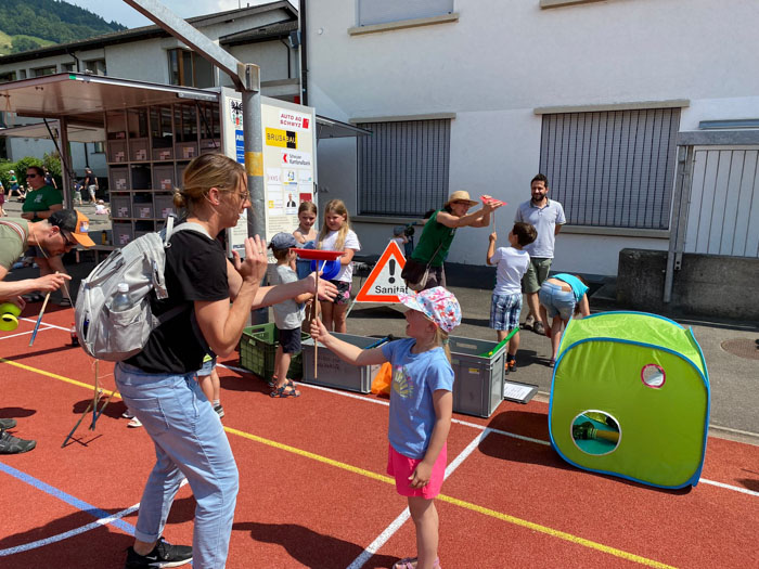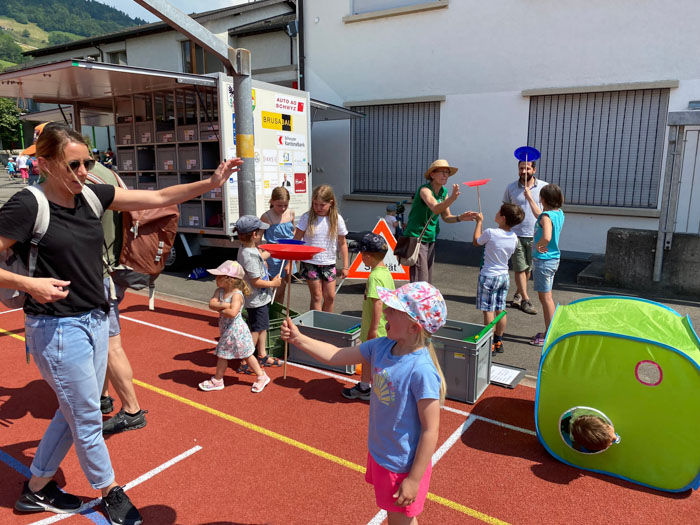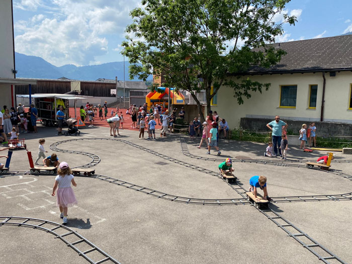 Gestartet hat die Feier um 11:00 Uhr und wie das so üblich ist, waren die ersten Gäste eher zurückhaltend, doch nicht lange. Schon bald kamen immer mehr Besucher und das ganze Primar-Schulhausareal wurde einmal mehr zum Spielplatz für alle. Die vielen Kinder, die wir an diesem Tag begrüssen durften, hatten alle Hände und Füsse voll zu tun und die Eltern durften sie einfach mal «gschirren» lassen. Egal ob es Spielzeuge aus dem Spielebus waren, oder die Kindereisenbahn zum selber angeben, alles wurde intensiv genutzt. Natürlich durfte die Mohrenkopfschleuder nicht fehlen und die Besucher warteten sehnlichst darauf, den ersten Mohrenkopf zu verspeisen.