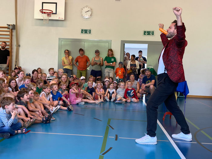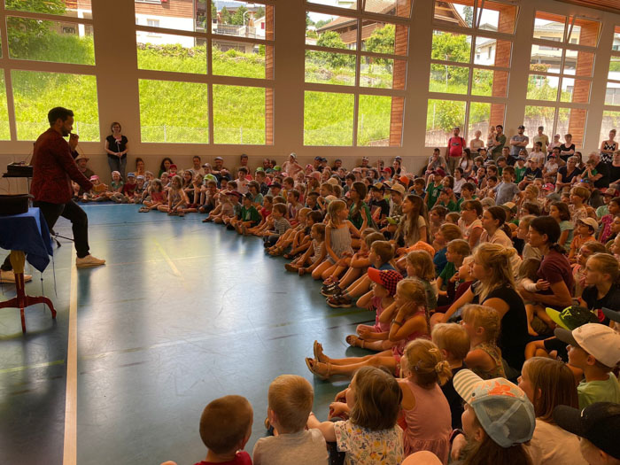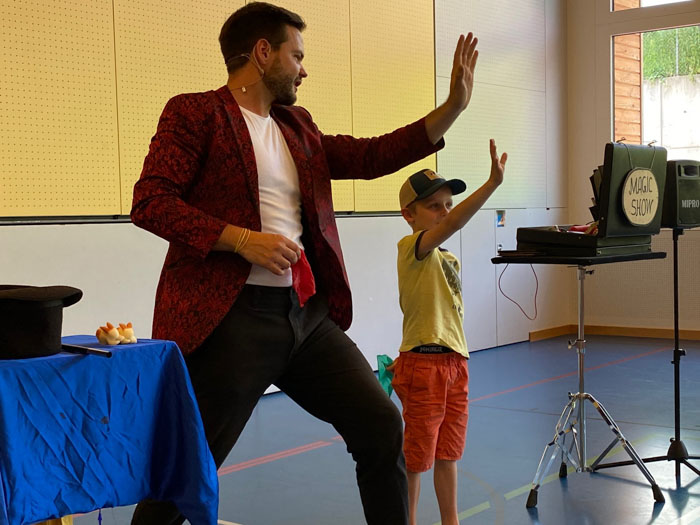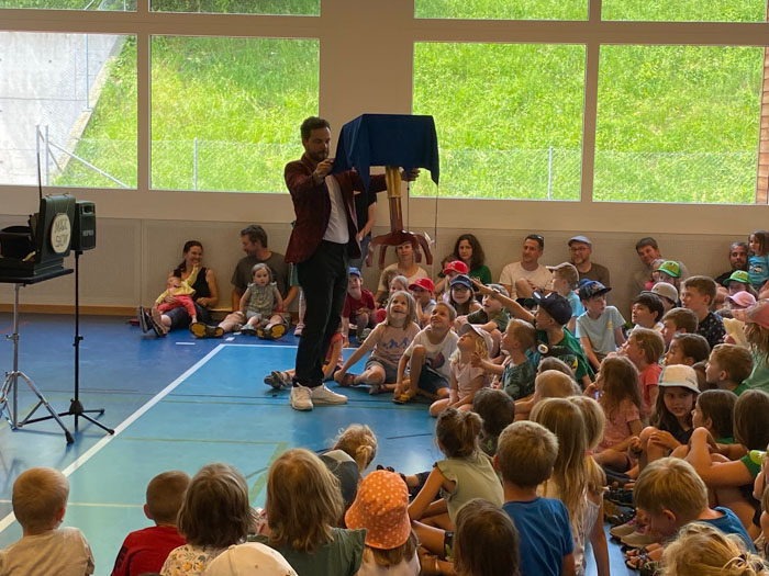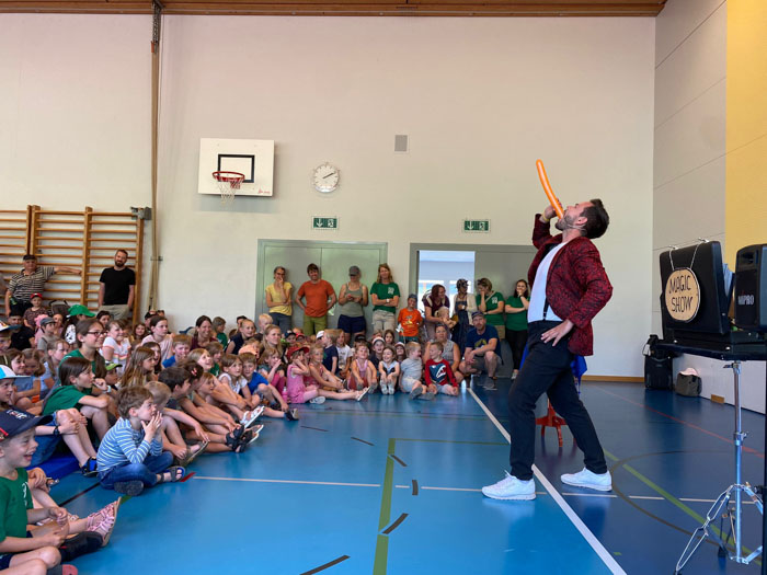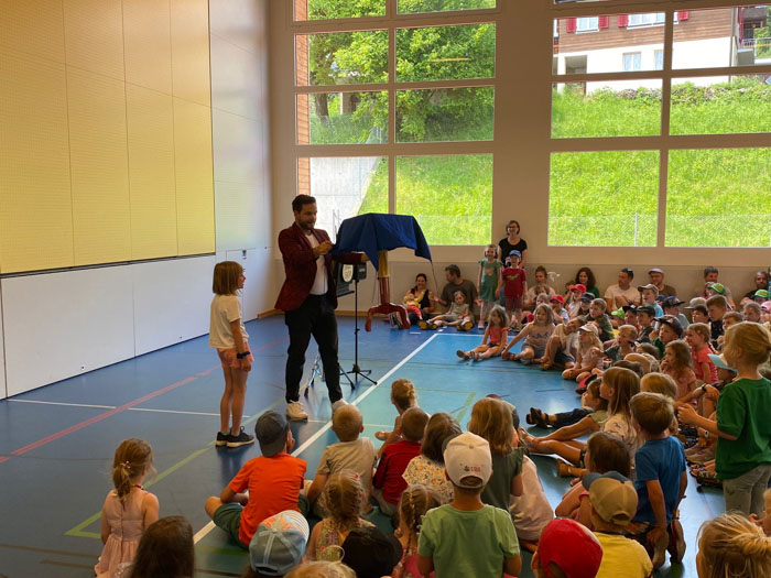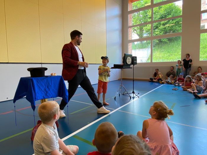 Pünktlich zur Hauptattraktion versammelten sich fast alle Besucher in der Turnhalle und wurden mit einer kurzen Ansprache unserer Präsidentin Ceren Renggli offiziell begrüsst. Dann startete die Zaubershow mit Jovi, der einem kritischen Publikum gegenüber stand. Doch auch dieses Publikum konnte er mit seinen tollen Zauberkünsten in seinen Bann ziehen und hinterliess lachende, wenn auch etwas nachdenkliche Gesichter. Nebst den vielen spielerischen Attraktionen durften sich die Gäste auch fürs Kinderschminken anstellen und liessen sich zauberhafte und tolle Motive aufmalen. Die Nachfrage war sehr gross und unsere externen Schminkerinnen konnten erst durch den Einsatz des Jugi Teams und den Indoor Parcours in der Turnhalle entlastet werden.